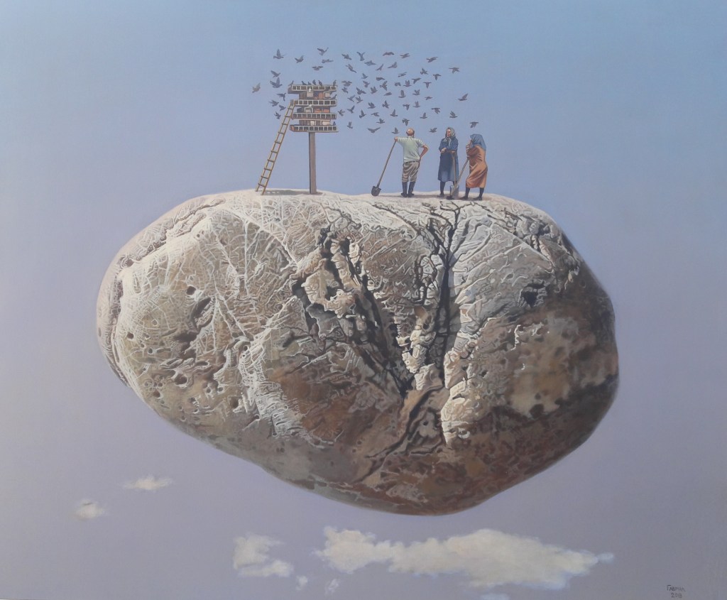 He reminds me of the work of Belgian surrealist René Magritte (1898 – 1967) as the paintings of both artists share common themes.